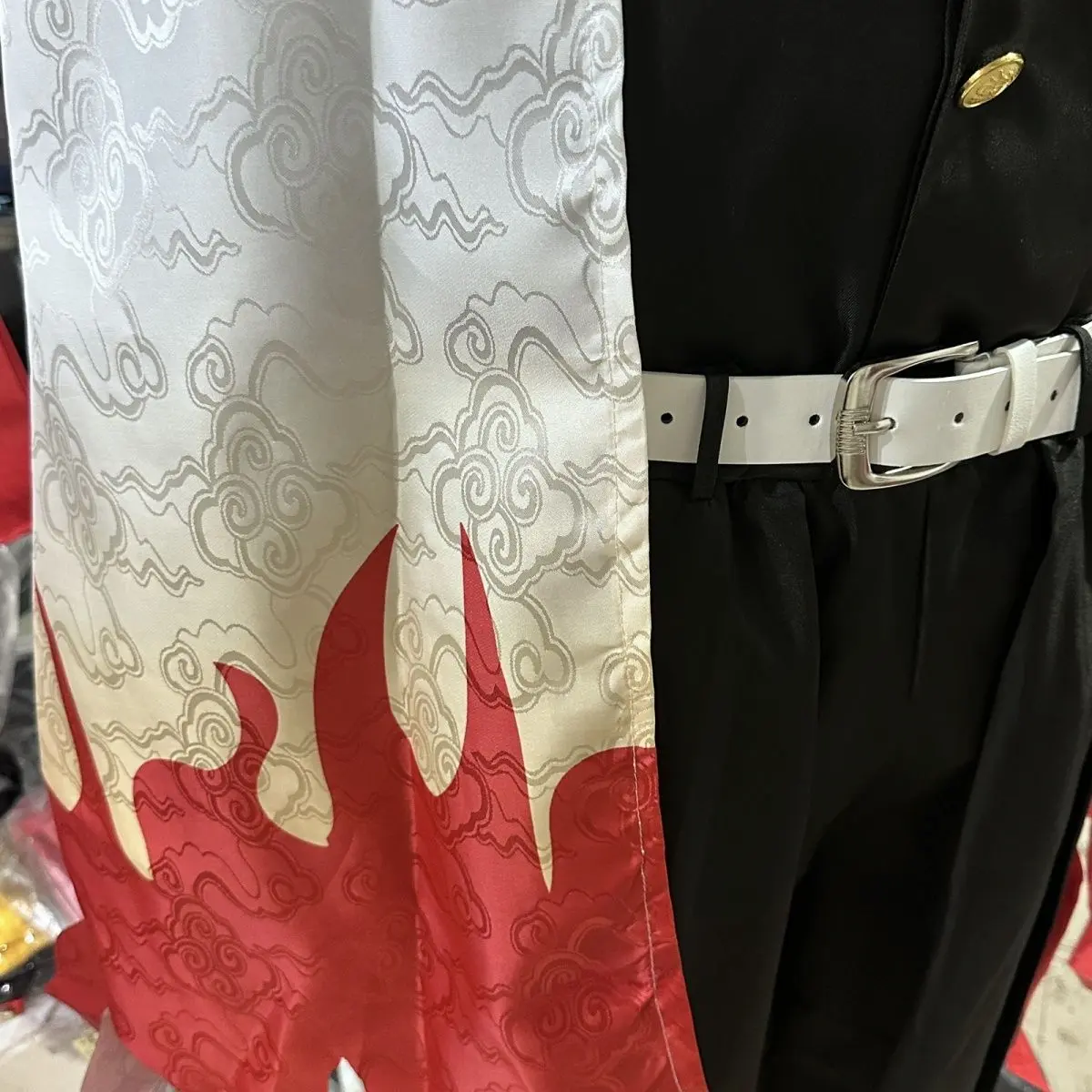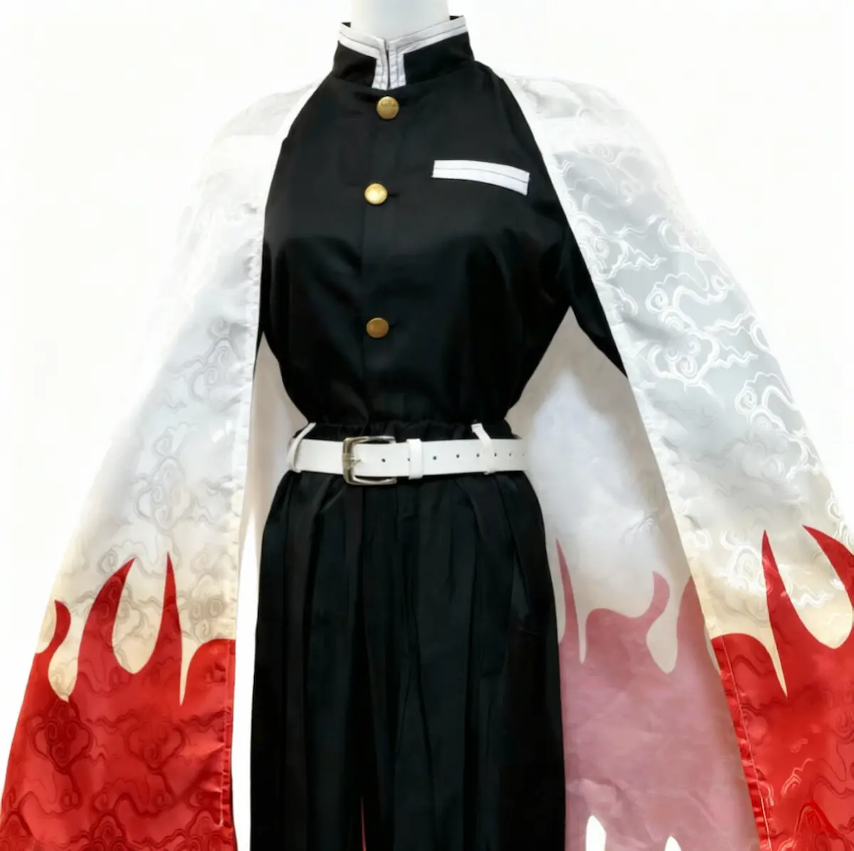 The embroidery creates a raised texture and stronger visual presence, making the back detail stand out naturally in photos and at conventions. This small upgrade in craftsmanship gives the costume a more premium feel and durability, which is appreciated by collectors and dedicated fans of Demon Slayer: Kimetsu no Yaiba and the character Kyojuro Rengoku.