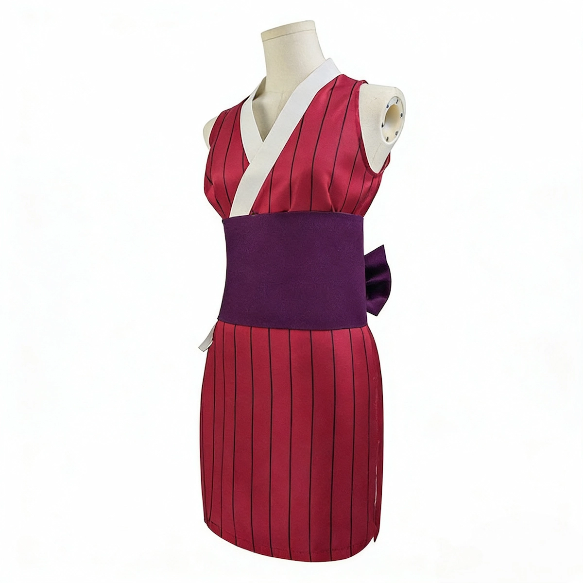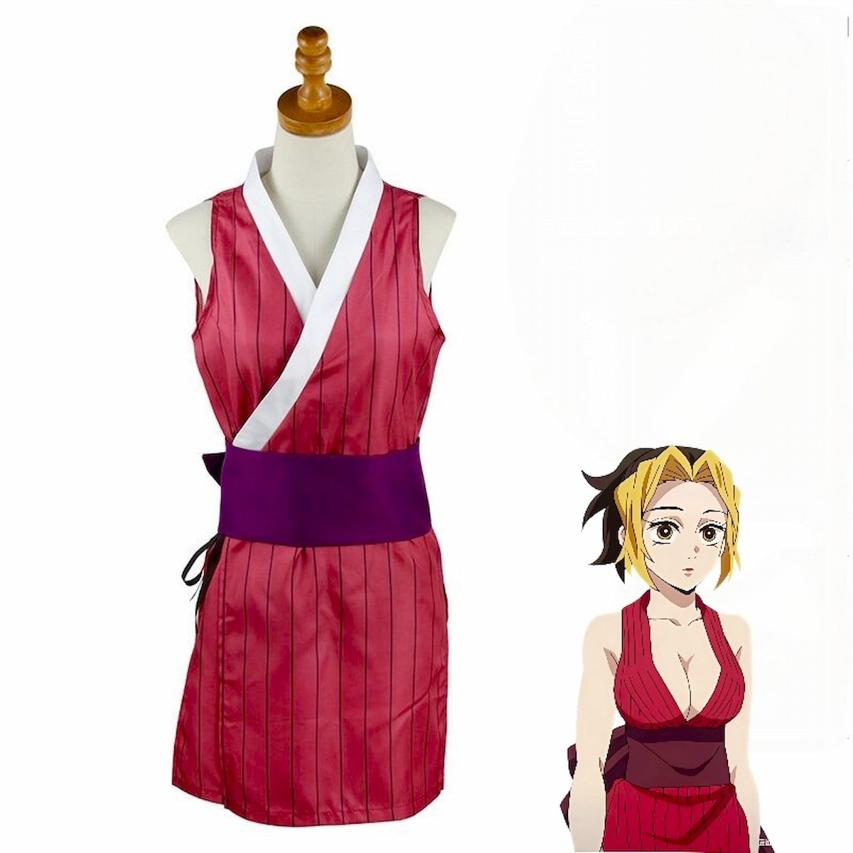 The costume includes a Red sleeveless striped dress, Black obi, and Bow, recreating Makio’s iconic Demon Slayer outfit.