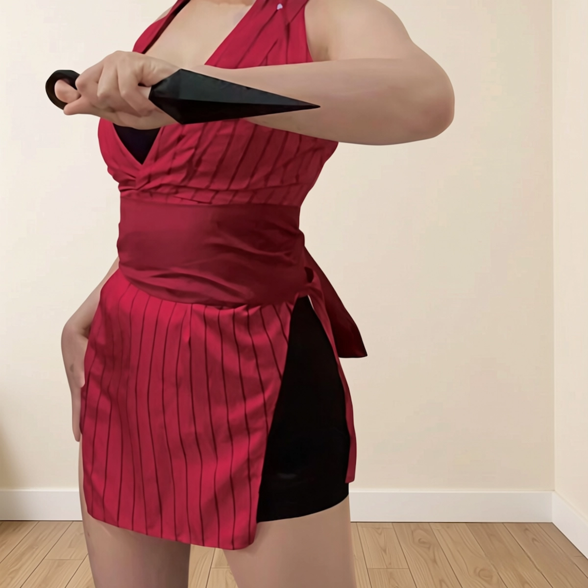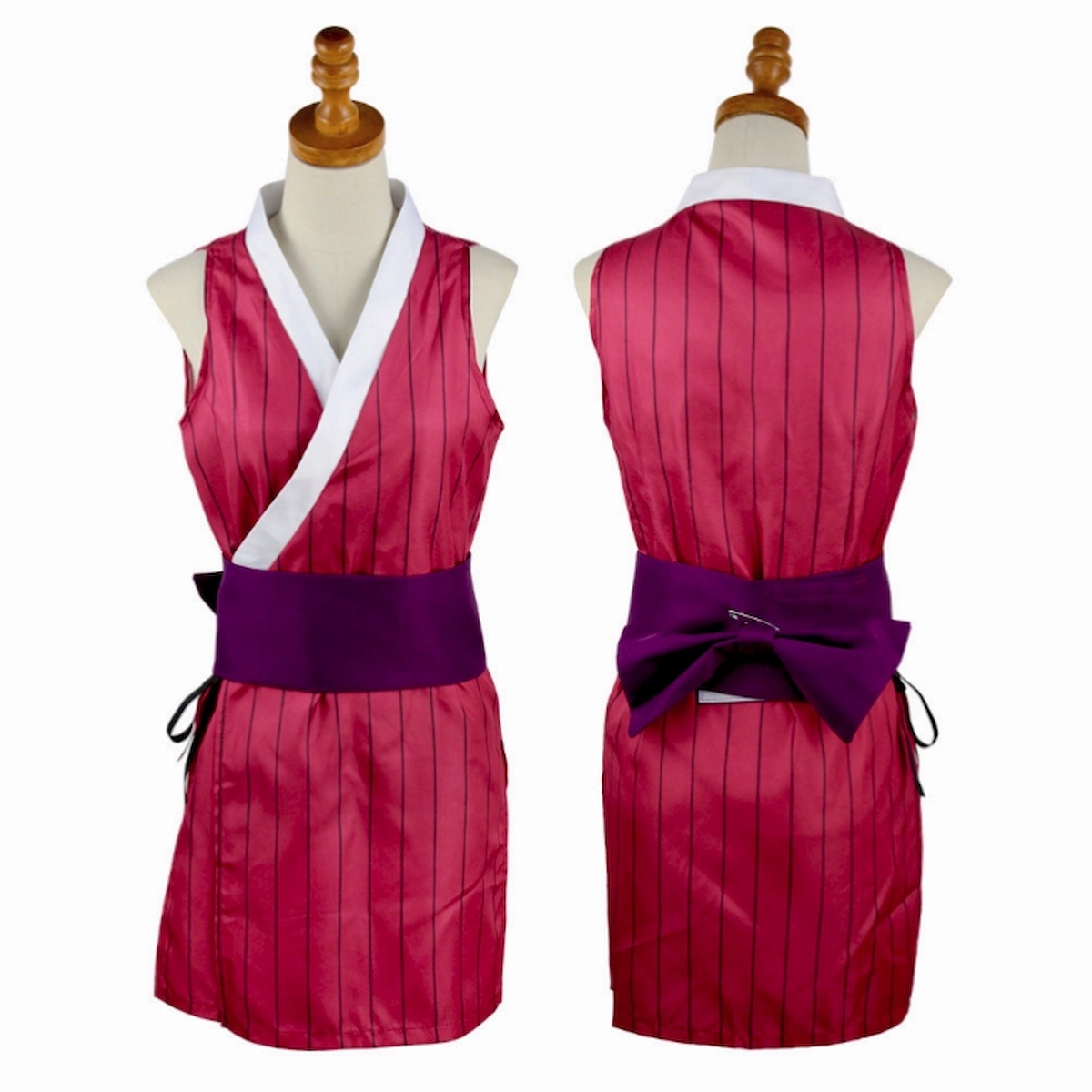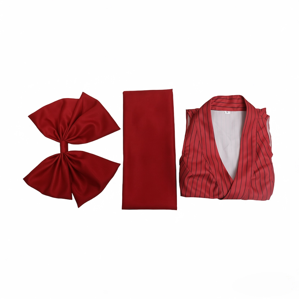 • Complete Makio Cosplay outfit set, including Red sleeveless striped dress, Black obi and Bow